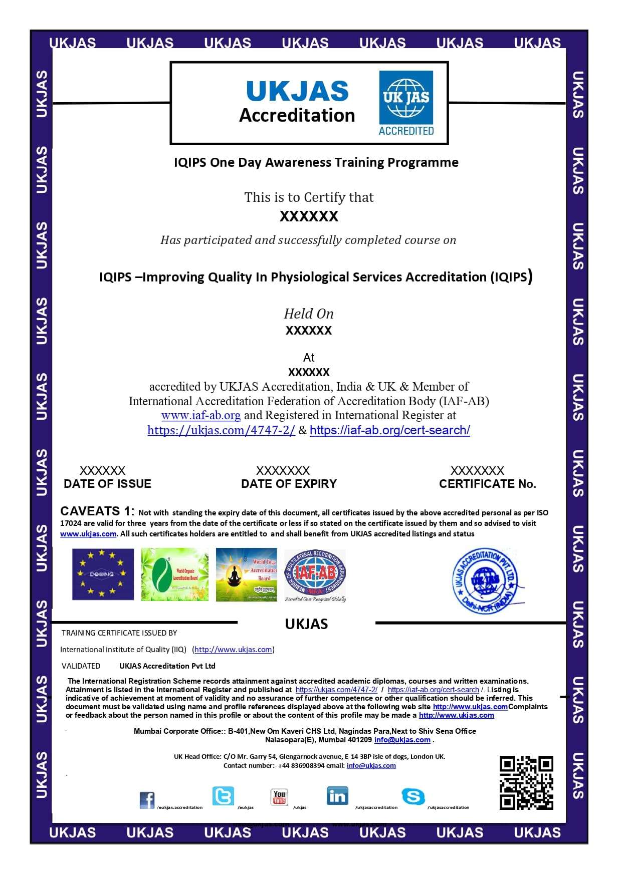 As is widely known, UKJAS Accreditation Pvt. Ltd  conducting various technical courses inviting interested personnel/technocrats for enhancing & fine-tuning of the skill. UKJAS Accreditation Pvt Ltdorganizing One Day Awareness Training Programme Classroom & online Training course for IQIPS- Improving Quality In Physiological Services Accreditation.