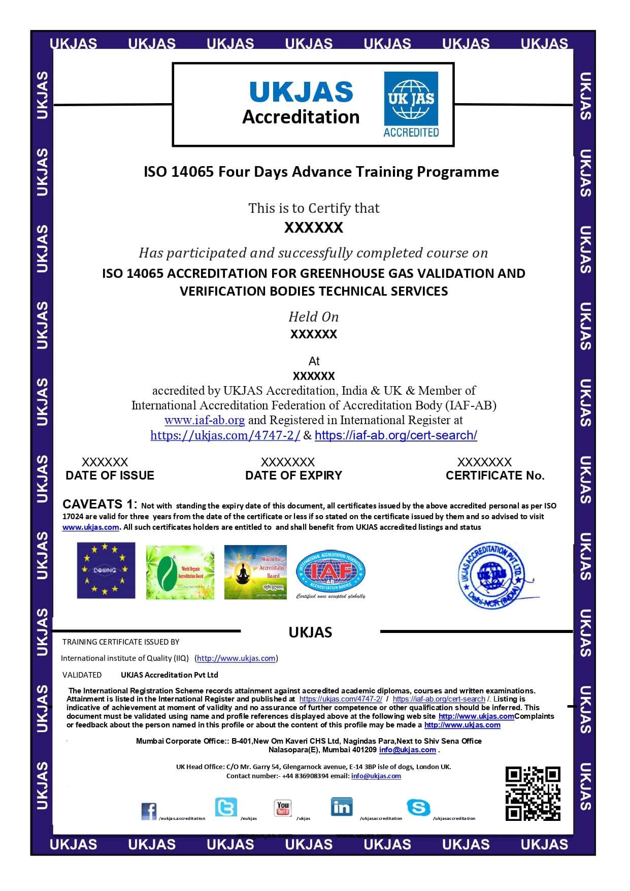 UKJAS Accreditation Pvt. Ltd organizing 4 Days Advance Training Programe Classroom & online Training course for ISO 14065 ACCREDITATION FOR GREENHOUSE GAS VALIDATION AND VERIFICATION BODIES TECHNICAL SERVICES