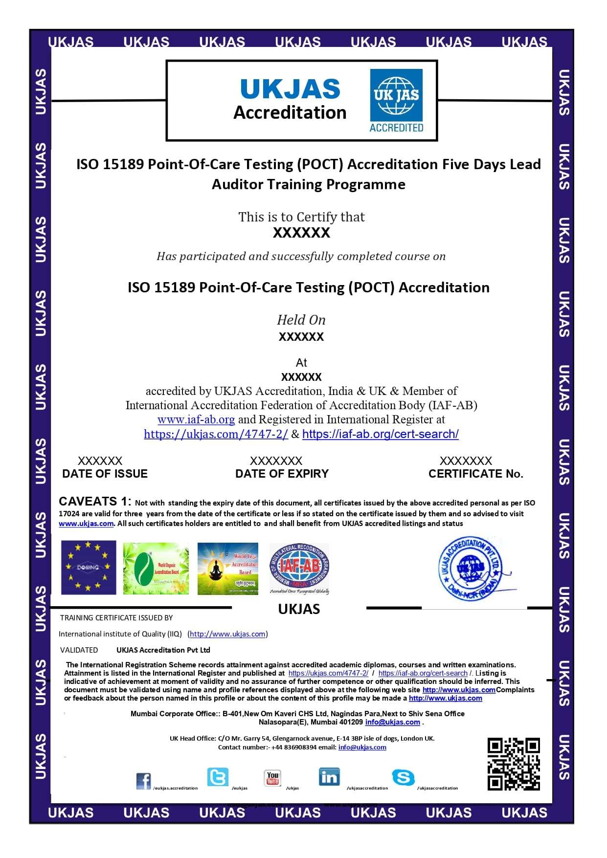 - 5 Days Lead Auditor Training program of ISO 15189 Point-Of-Care Testing (POCT) Accreditation and any other program is Rs 25000+18%GST Payment should be made by Cheque / DD in favor of “UKJAS Accreditation Pvt.Ltd, Mumbai