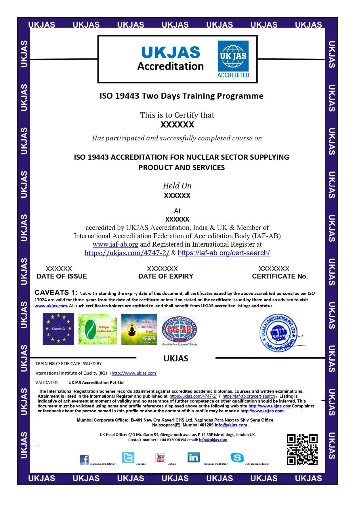 UKJAS Accreditation Pvt. Ltd organizing 2 Days Training Programe Classroom & online Training course for ISO 19443 Accreditation for Nuclear Energy Sector Supplying Products and Services