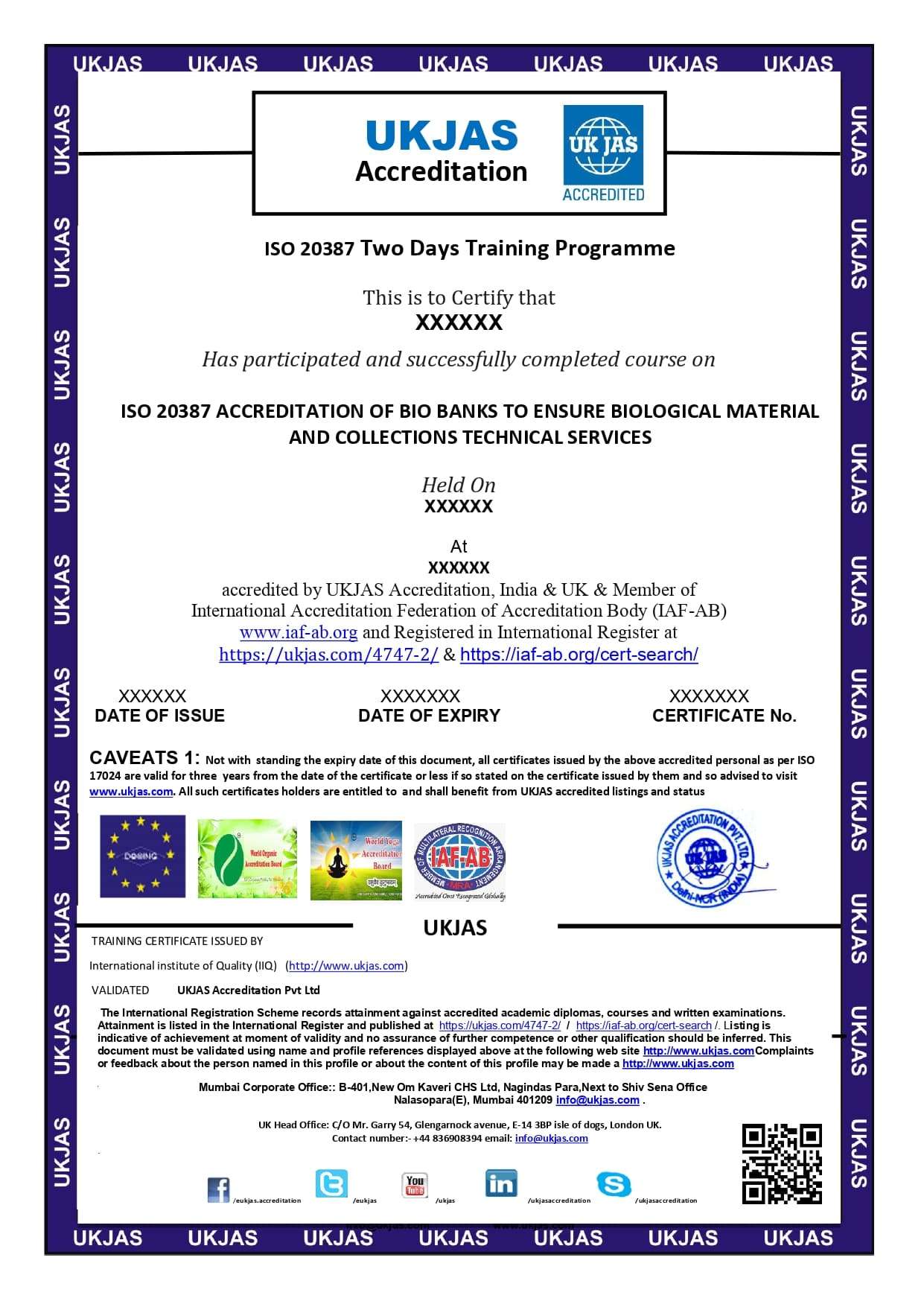 UKJAS Accreditation Pvt.  Ltd organizing 2 Days Training Programe Classroom & online Training course for ISO 20387 ACCREDITATION OF BIO BANKS TO ENSURE BIOLOGICAL MATERIAL AND COLLECTIONS TECHNICAL SERVICES