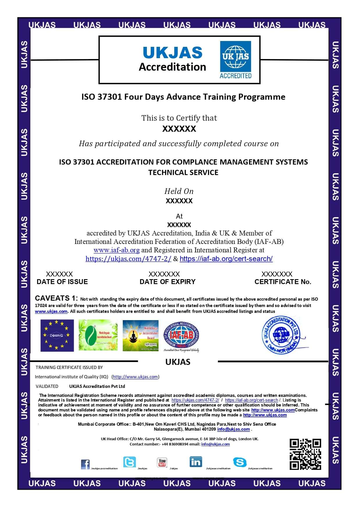 UKJAS Accreditation Pvt. Ltd organizing 4 Days Advance Training Programe Classroom & online Training course for ISO 37301 ACCREDITATION FOR COMPLANCE MANAGEMENT SYSTEMS TECHNICAL SERVICE