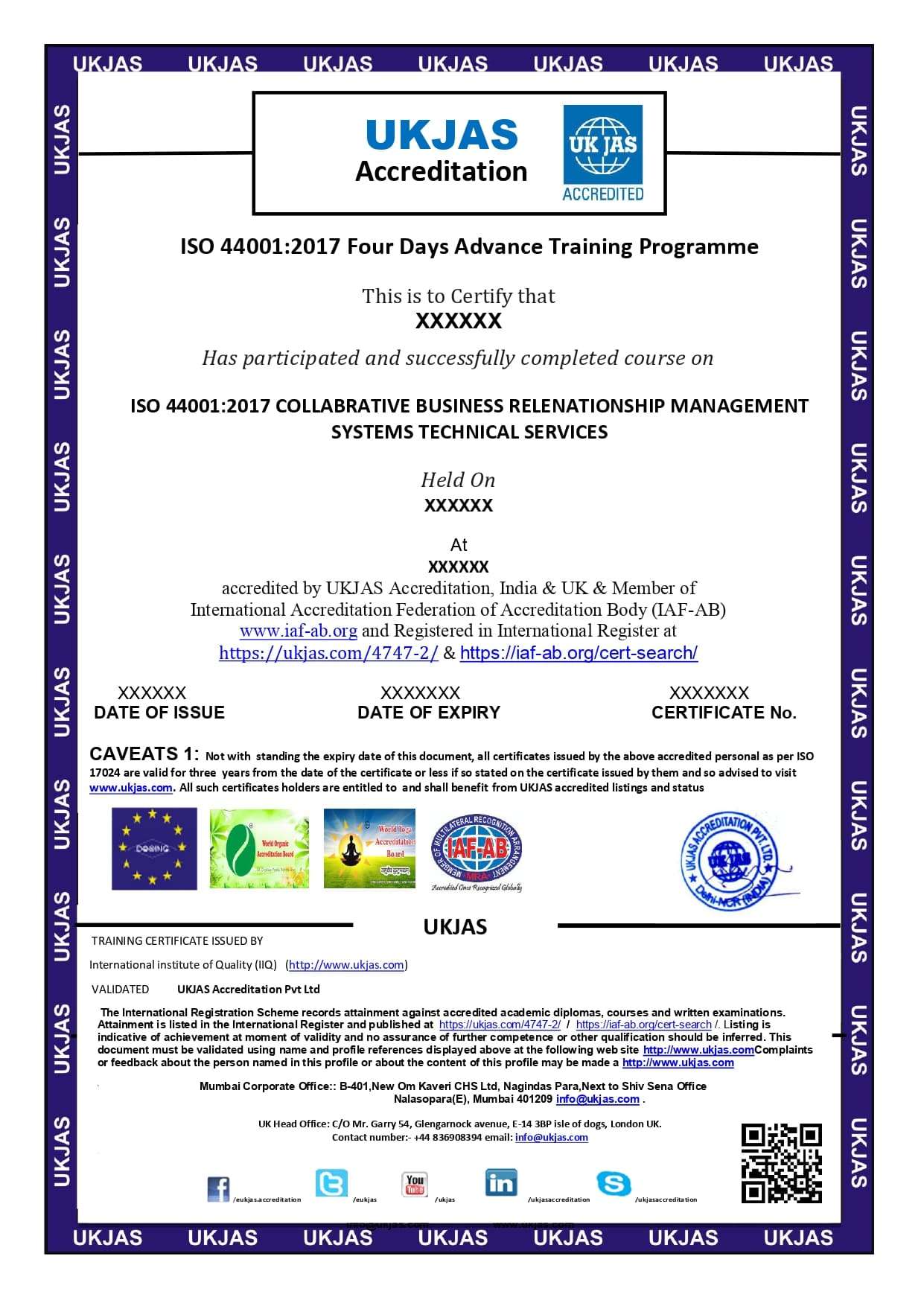 UKJAS Accreditation Pvt. Ltd organizing 4 Days Advance Training Programe Classroom & online Training course for ISO 44001:2017 COLLABORATIVE BUSINESS RELATIONSHIP MANAGEMENT SYSTEMS TECHNICAL SERVICES