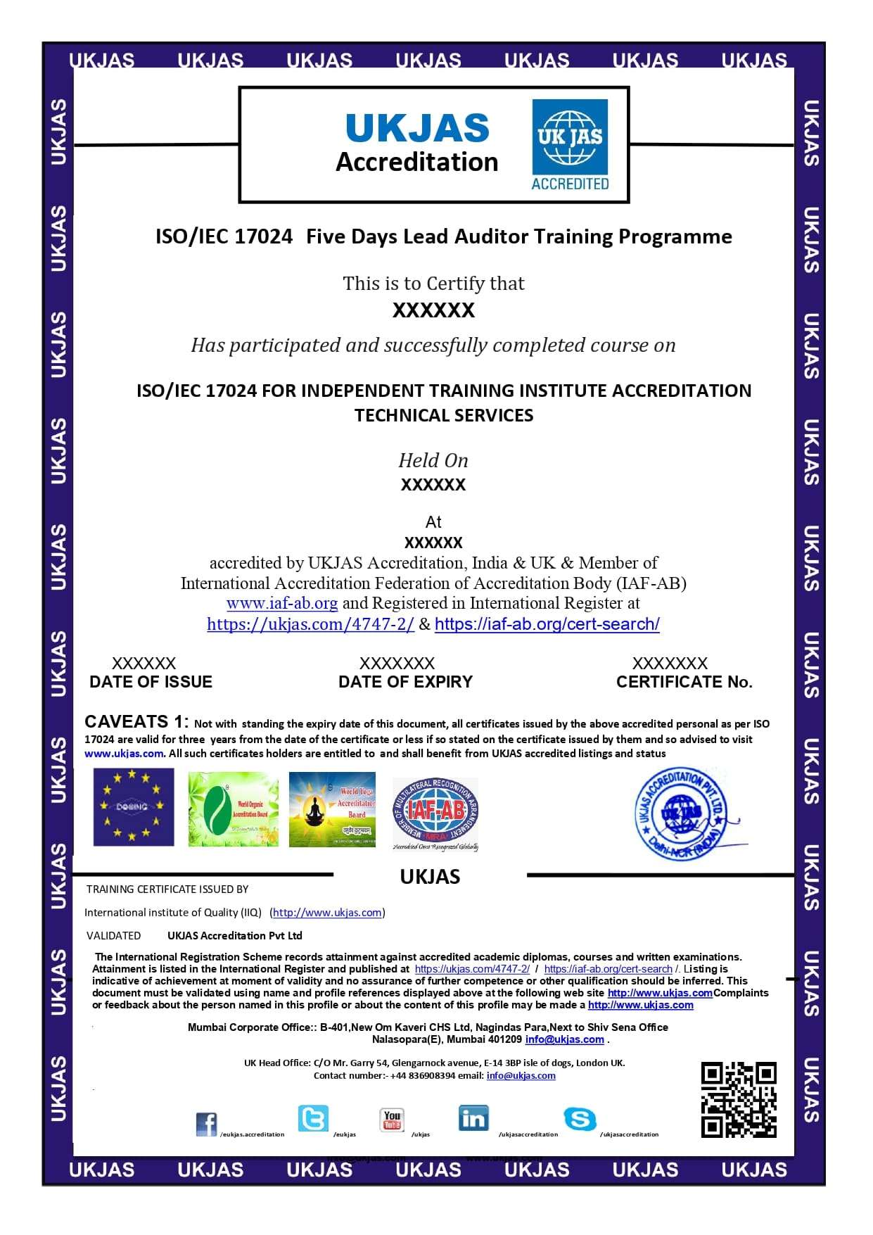 UKJAS Accreditation Pvt. Ltd organizing 5 Days Lead Auditor Training Programe Classroom & online Training course for ISO/IEC 17024 FOR INDEPENDENT TRAINING INSTITUTE ACCREDITATION TECHNICAL SERVICES.