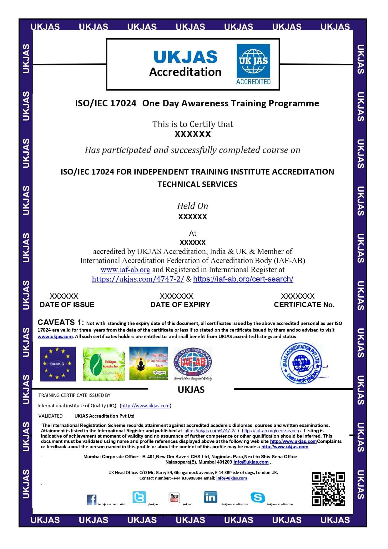 - 1 Day Awareness Training program of ISO/IEC 17024 FOR INDEPENDENT TRAINING INSTITUTE ACCREDITATION TECHNICAL SERVICES. . and any other program is Rs 5500+18%GST Payment should be made by Cheque / DD in favor of “UKJAS Accreditation Pvt Ltd, Mumbai